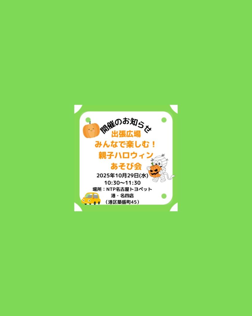 いつもの広場を飛び出して、はみんぐが出張広場を開催します 今回は大手学区にある「NTP名古屋トヨペット港・名四店さん」で開催します。 ハロウィン親子あそびの会をします ハロウィンの工作や親子ふれあい遊びなどをします。 おみやげがもらえるかも!?...