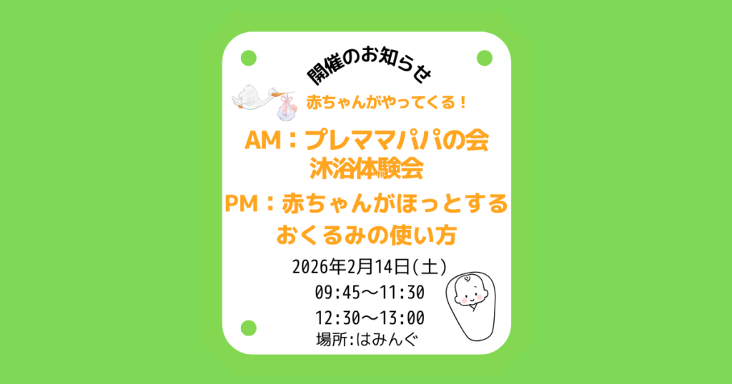 はみんぐ 2026年2月14日(土) 赤ちゃんがやってくる!プレママパパの会 沐浴体験会&赤ちゃんがほっとするおくるみの使い方 開催のお知らせ