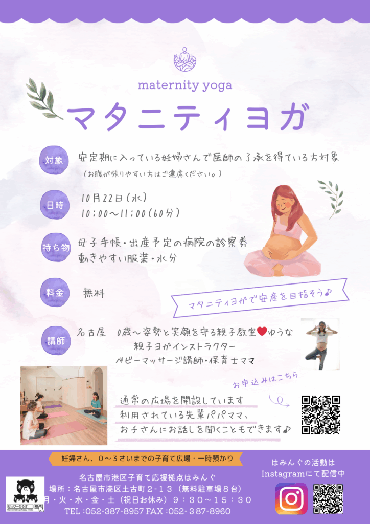 【対象】安定期に入ってる方で医師の了解を得ている方 ※お腹が張りやすい方はご遠慮ください