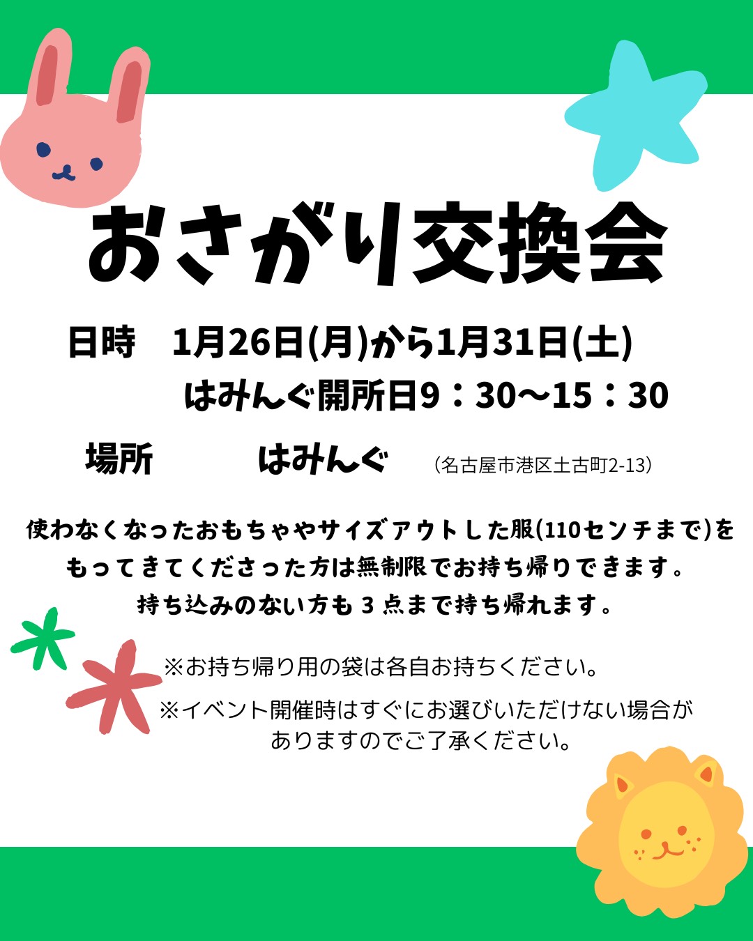 【対象】これから出産を迎える妊婦さん、乳幼児の子育て世帯またその家族 ※交換するものがなくても1来所ごとに3点までお持ち帰り可能です