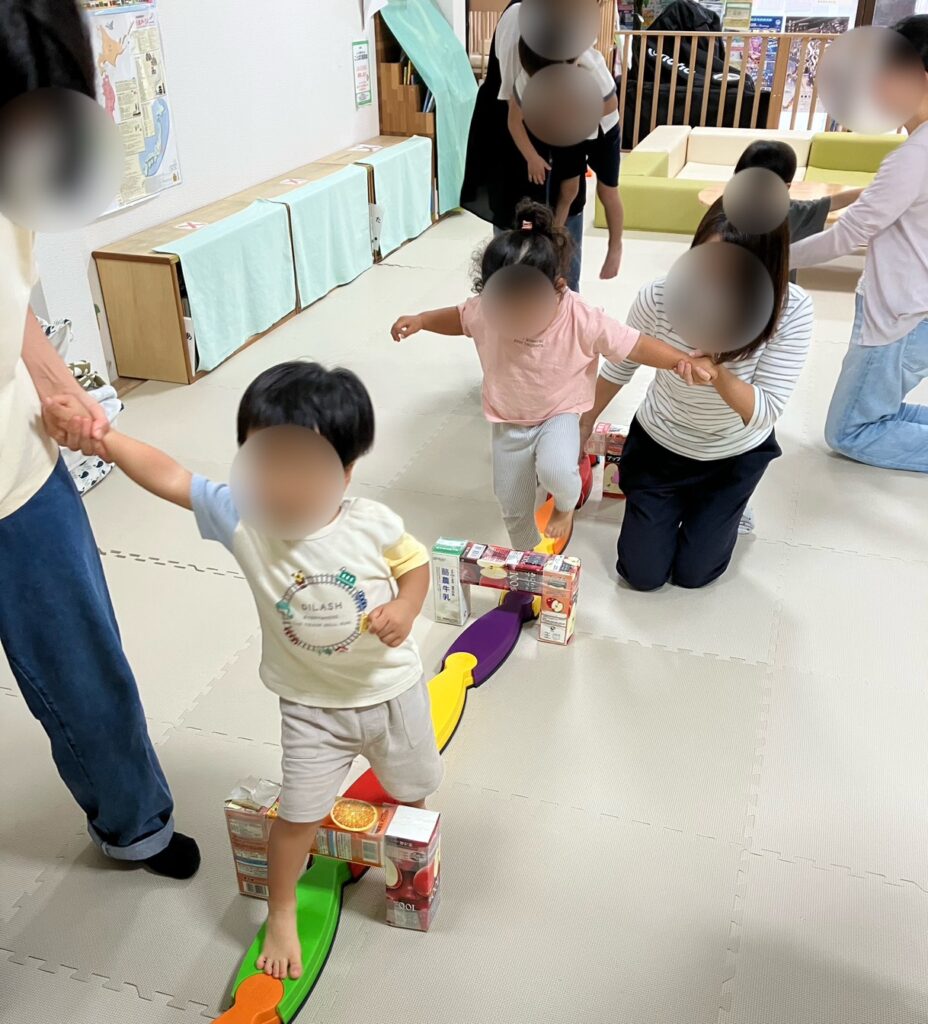 トランポリンもしました。待ち時間に牛乳パックの積み木を3つ積みました☺