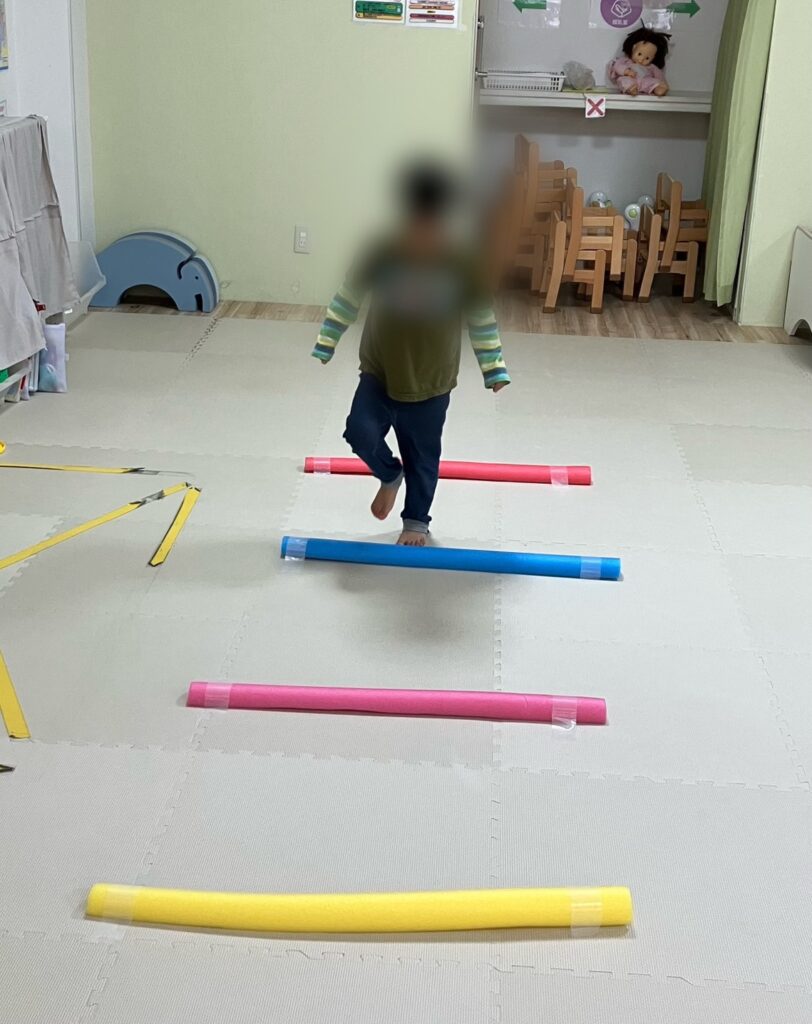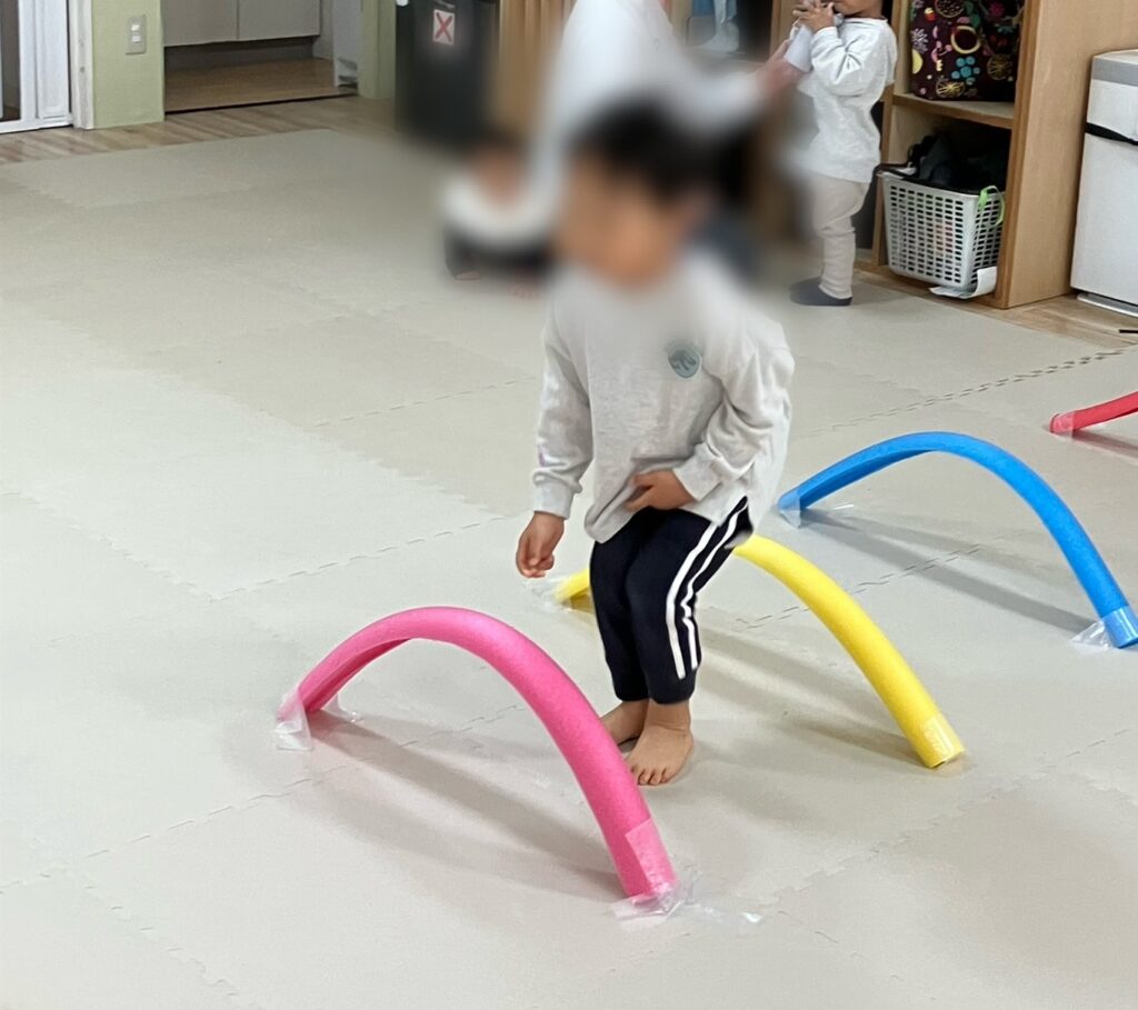 まずはプールスティックを踏まないように歩いてゆっくり移動したり、早歩きで移動しました(^^)