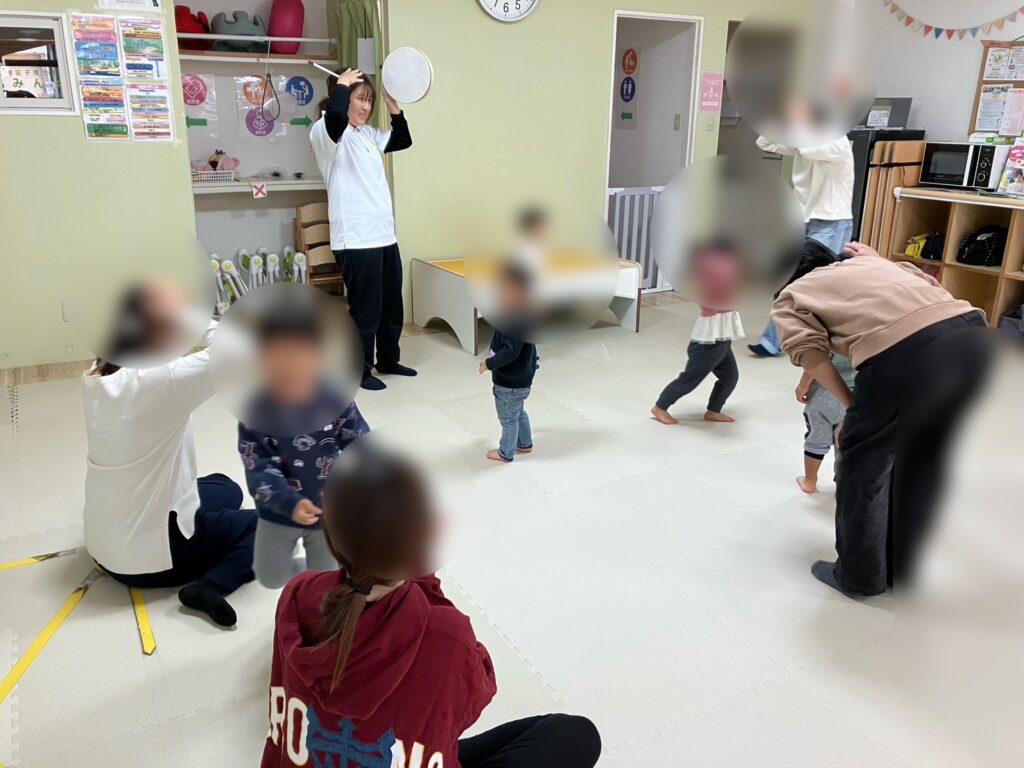 太鼓に合わせて駆け足で足踏みをして身体の部位を触る取り組みをしました。