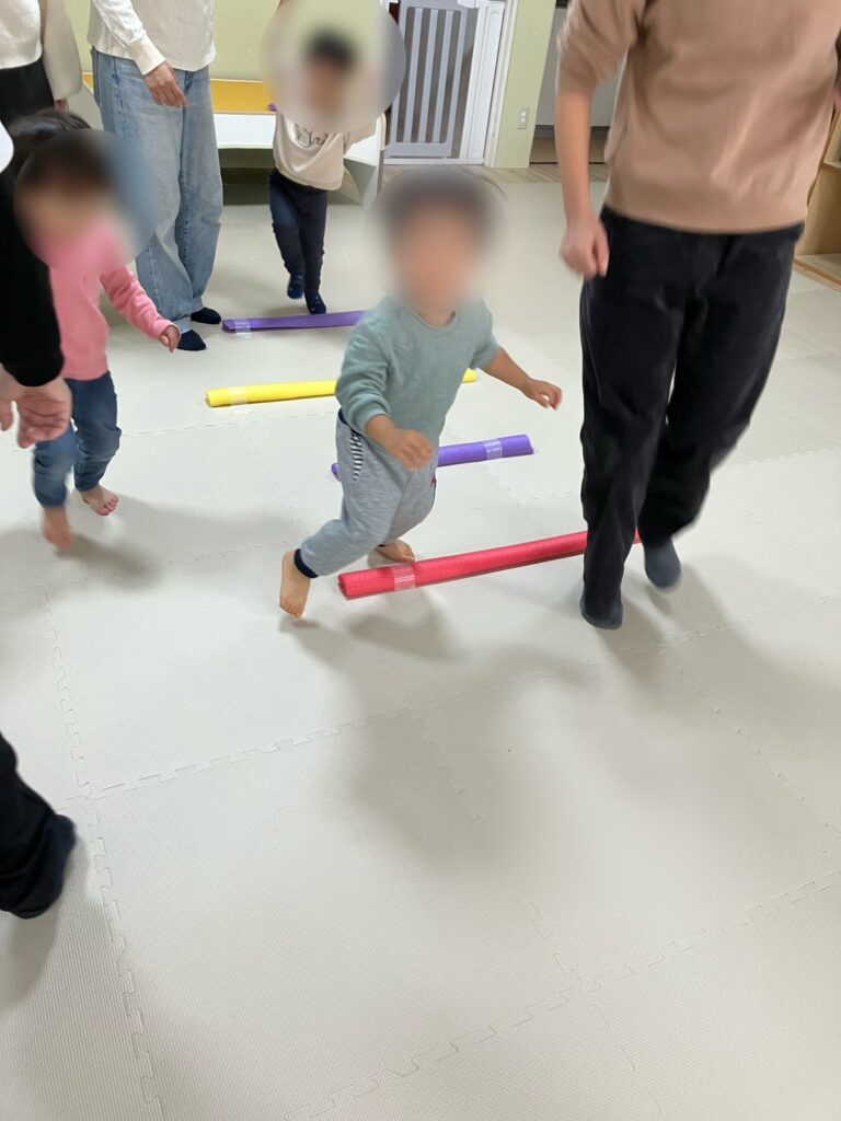 プールスティックを縦に半分に切ったものを置いてジャンプしたり、プールスティックの上を落ちてしまわないように