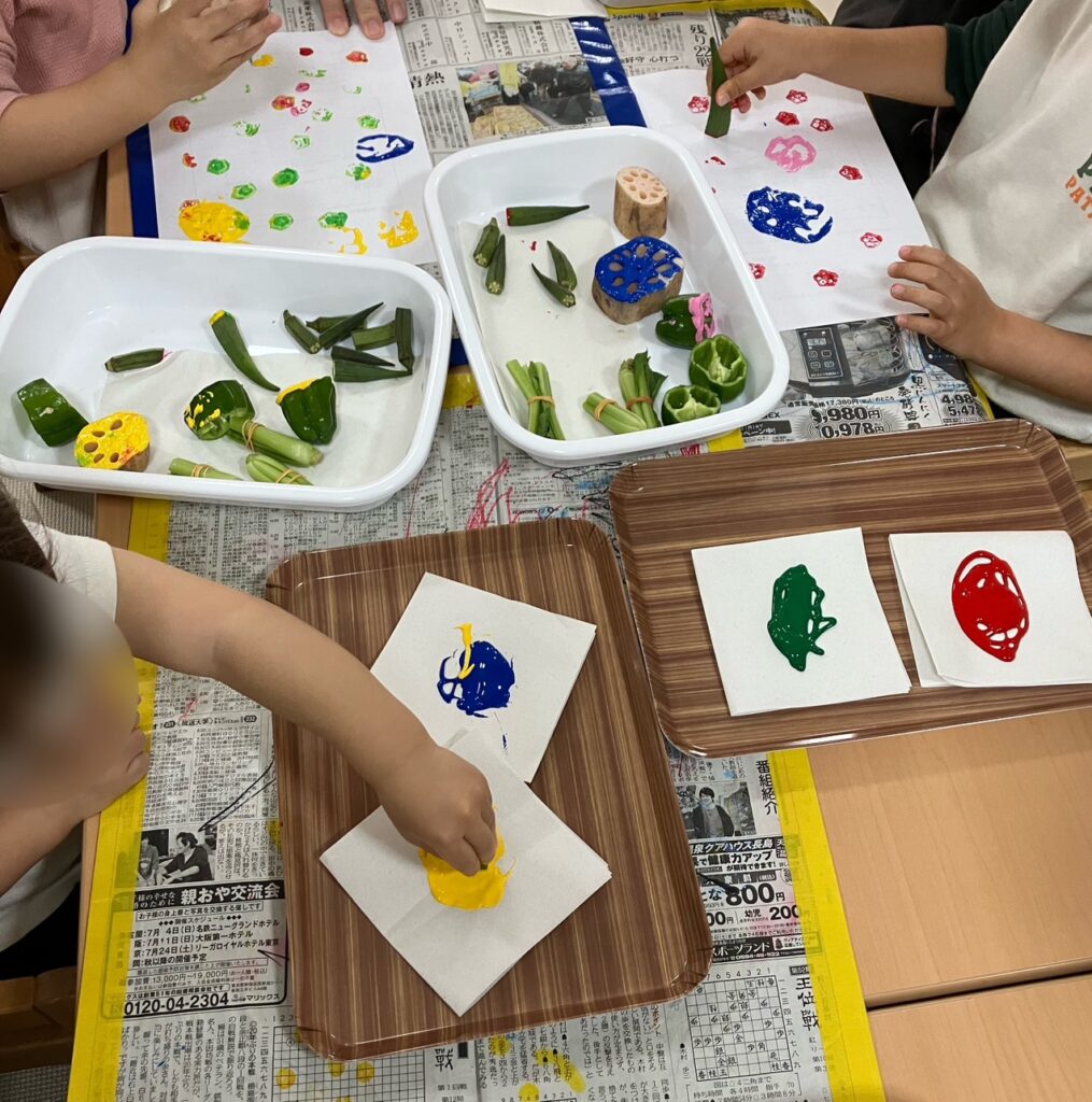 今日は,色々な野菜を切って、断面を使ってスタンプにしてみました。