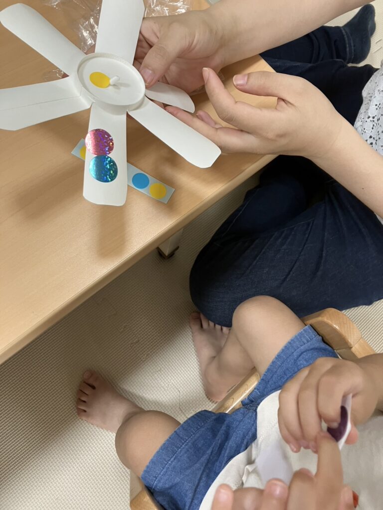 風車の飾り付けや組み立てをして、完成したら息をふ~っと吹きかけました。