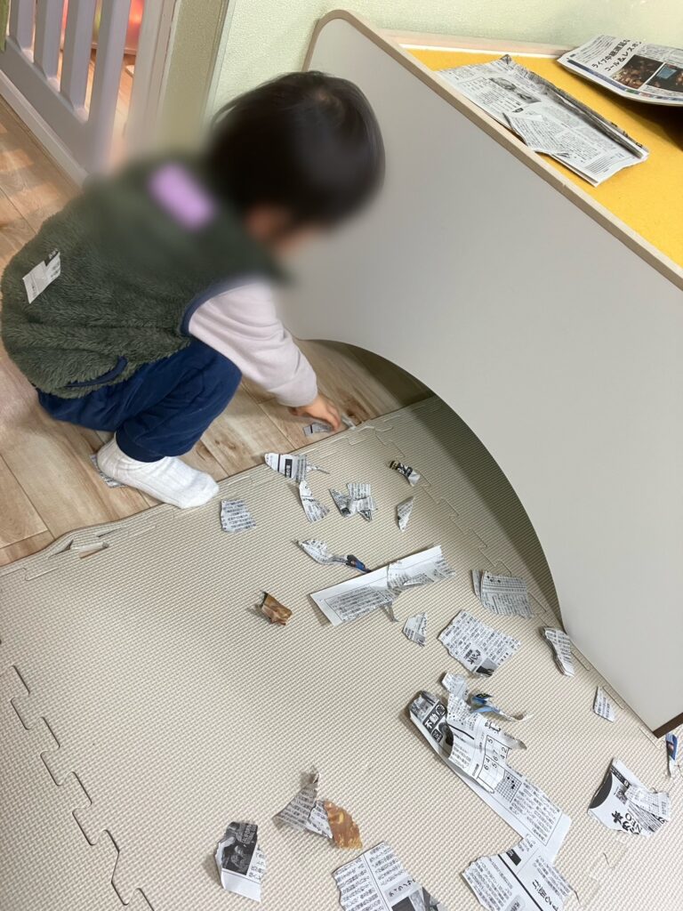 新聞紙を勢いよくちぎったり、細かくしたり、集めたり