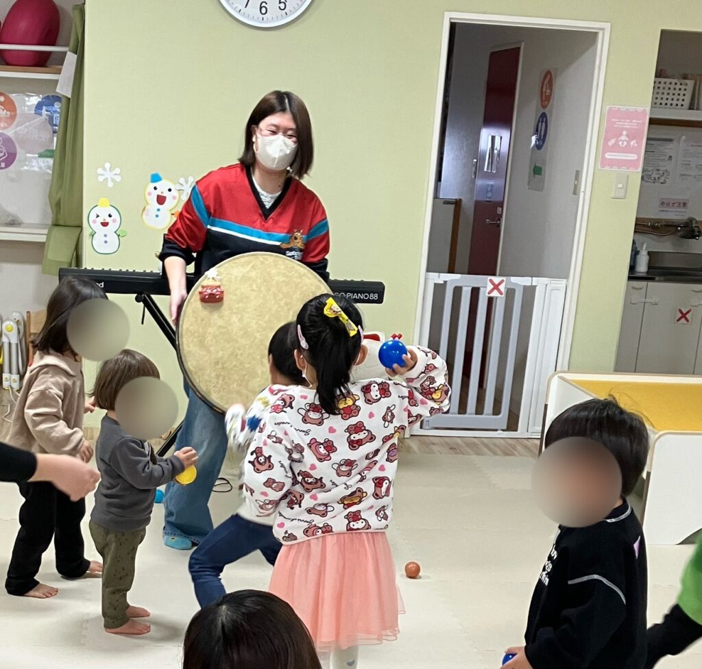最初に、お名前の歌。太鼓をたたきながら、自分の名前でお返事できました!