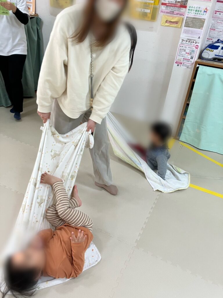 最初はタオルでジャンプして遊んだり、ゆらゆらしてみたり