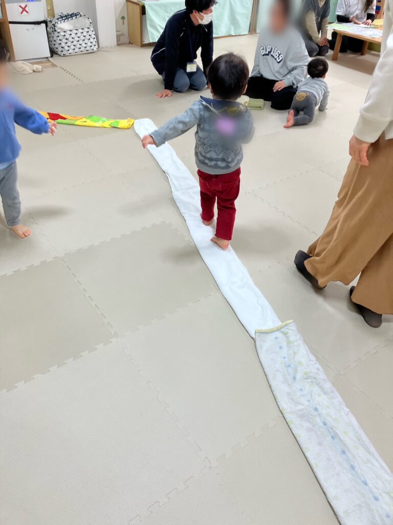 最後はタオルを一本橋に見立てて落ちないように歩きました♫